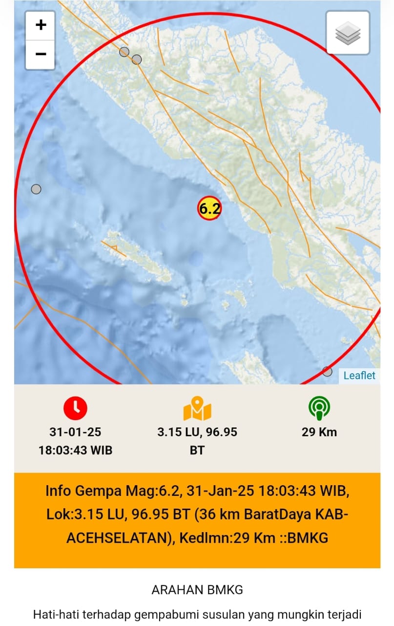 Kepala Stasiun Geofisika Mata Ie Aceh Besar Andi Azhar Rusdin mengatakan, Gempa Mag:6.2 Lokasi 3.15 LU,96.95 BT (36 km Barat Daya Kabupaten Aceh Selatan Kedalaman 29 Km, tidak berpotensi tsunami.