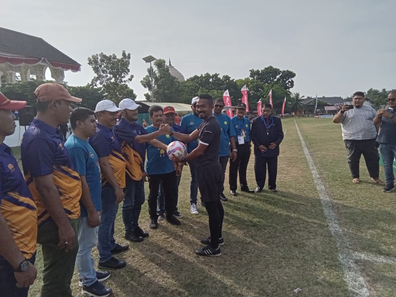 Sementara Ketua Asprov PSSI Aceh, Nazir Adam sebelum _kick- off_ Grup C tersebut menyerahkan bola kepada Wabub dan langsung menyerahkkan kepada wasit Hery Olo yang memimpin laga.