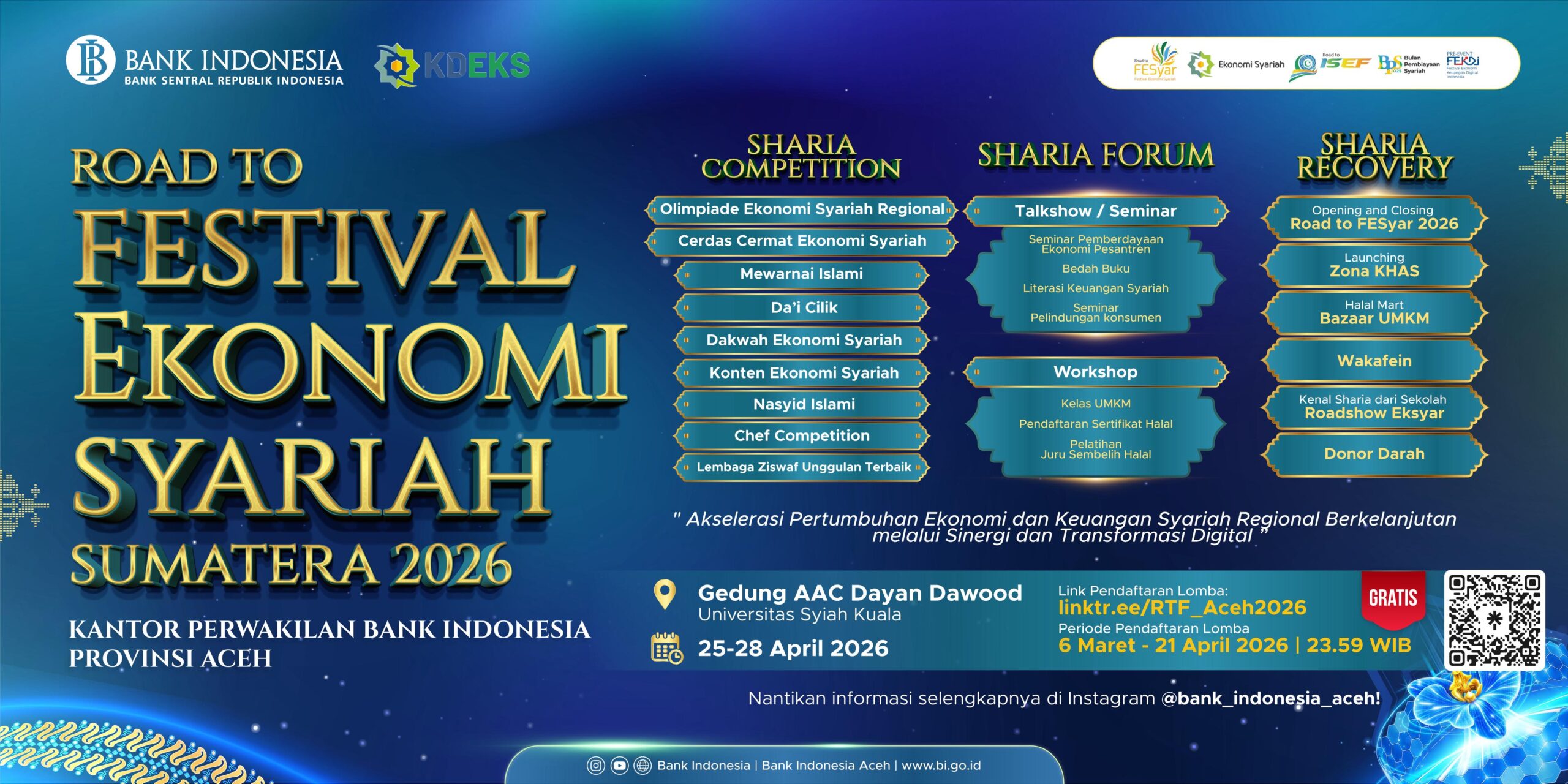 “Road to FESyar 2026 menjadi momentum strategis dalam mengakselerasi pertumbuhan ekonomi syariah di Aceh yang diproyeksikan sebagai salah satu pusat (hub) halal di wilayah Sumatera. Kegiatan ini juga merupakan bagian dari dukungan terhadap Indonesia Sharia Economic Festival (ISEF) 2026,” ujarnya.
