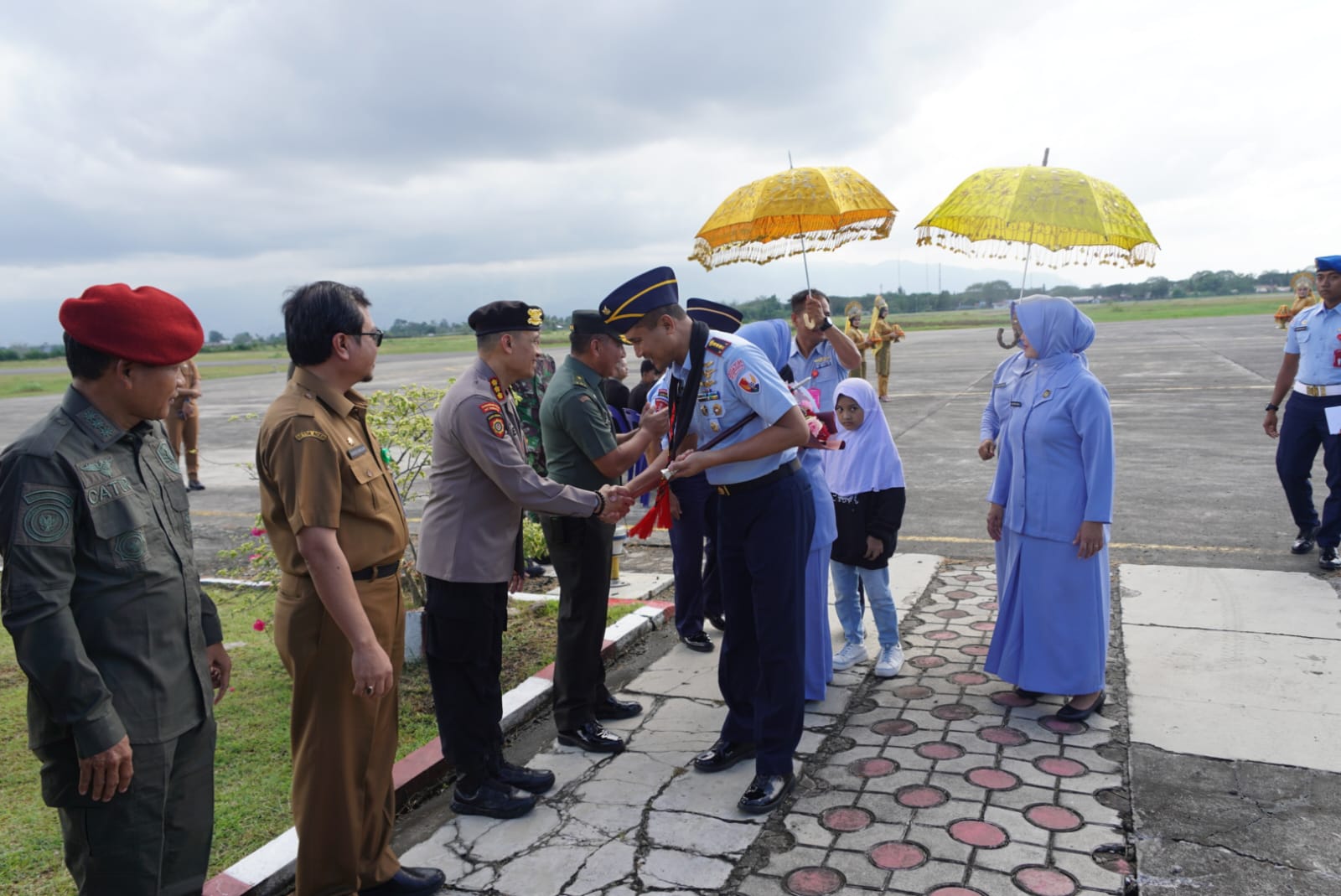 Habapublik.com, Kota Jantho : Dirsamapta Polda Aceh Kombes Ery Apriyono, mewakili Kapolda Aceh Irjen Achmad Kartiko menyambut kedatangan Danlanud Sultan Iskandar Muda (SIM) yang baru Kolonel Pnb Hantarno Edi Sasmoyo di Pangkalan Udara SIM Blang Bintang, Aceh Besar, Selasa, 20 Februari 2024.