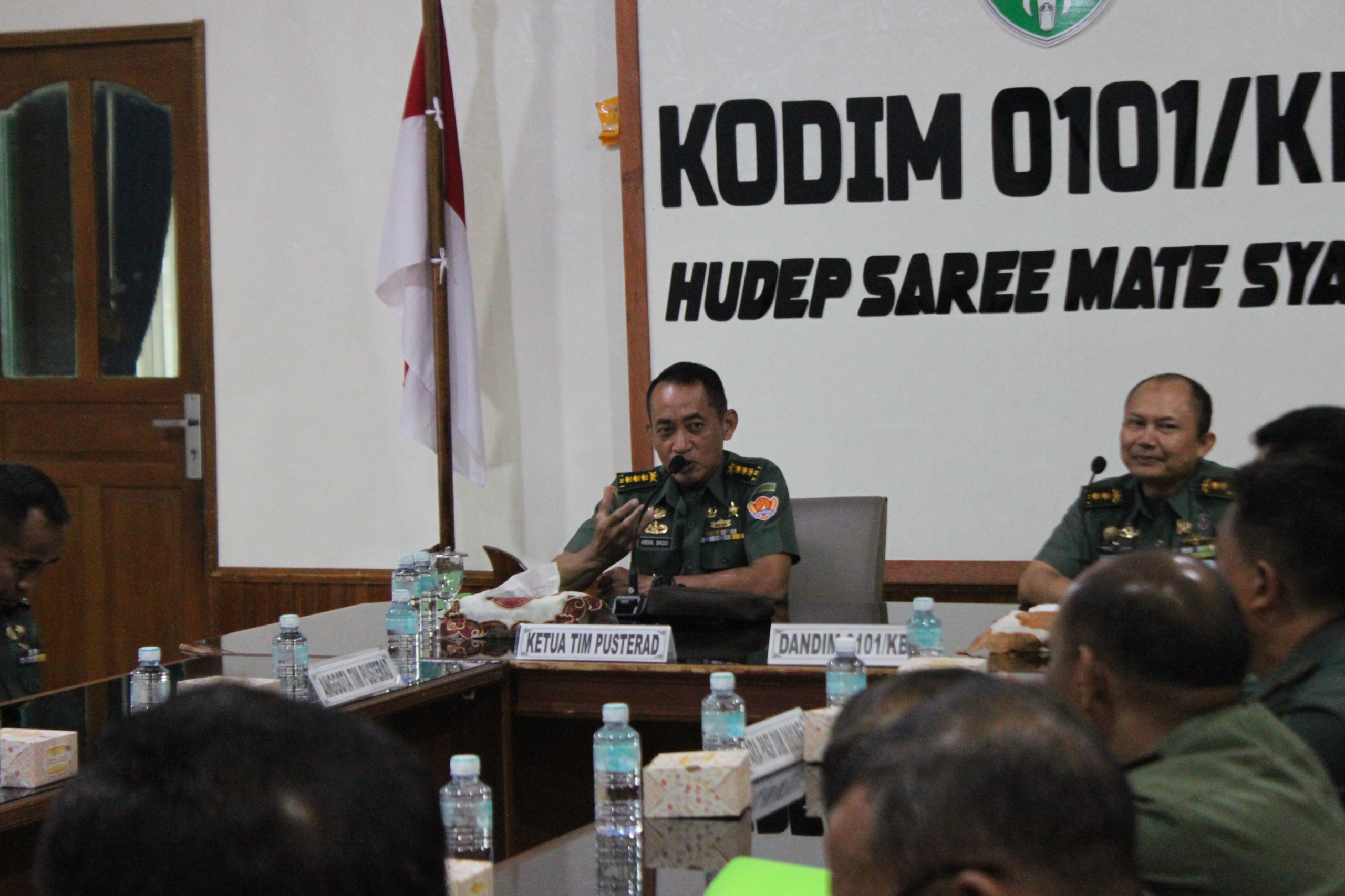 Komandan Kodim 0101/KBA Kolonel Czi Widya Wijanarko, S.Sos., M.Tr (Han) yang diwakili Kasdim 0101/KBA Letkol Arh Sugi Hantoro , S.T, M.I.P, Dalam sambutannya mengucapkan selamat datang kepada Kolonel Kav Abdul Basid, S.E, M.M. selaku ketua Tim berserta anggota dari Pusterad sekaligus ditandai dengan penyerahan Cendramata secara simbolis.