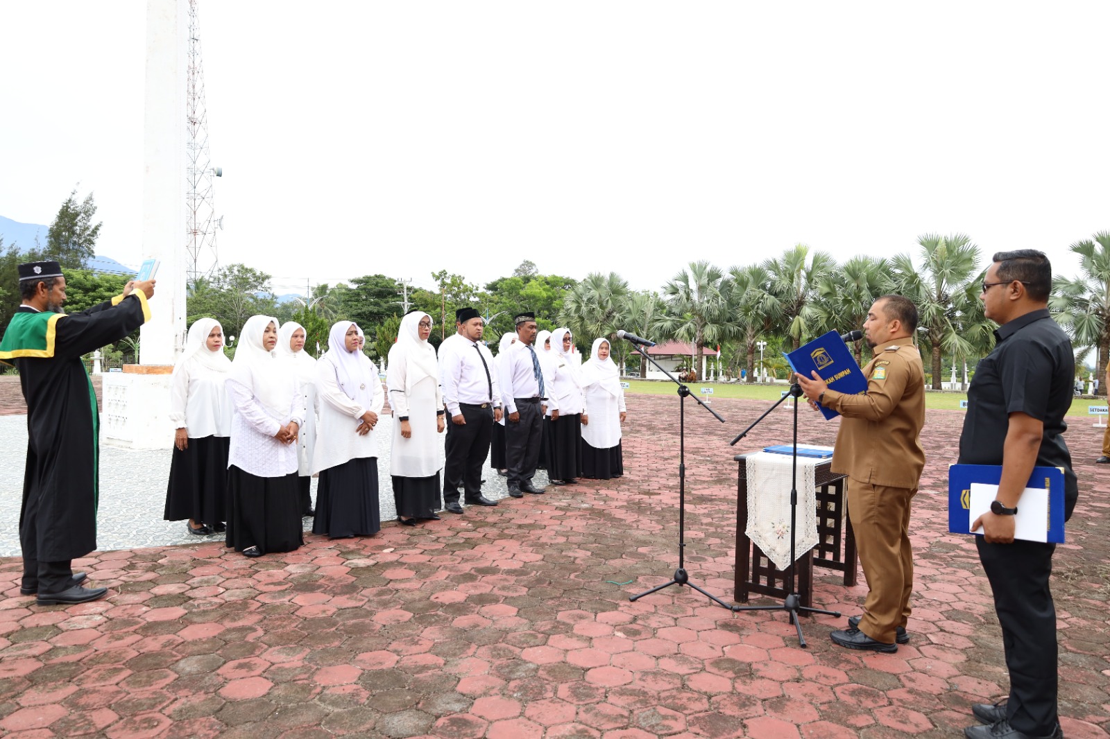 Pj Bupati Aceh Besar Muhammad Iswanto, S.STP MM melantik 14 orang kepala sekolah jajaran Dinas Pendidikan dan Kebudayaan Kabupaten Aceh Besar di halaman Kantor Bupati Aceh Besar, Kota Jantho, Senin (3/6/2024). FOTO/ PROKOPIM PEMKAB ACEH BESAR