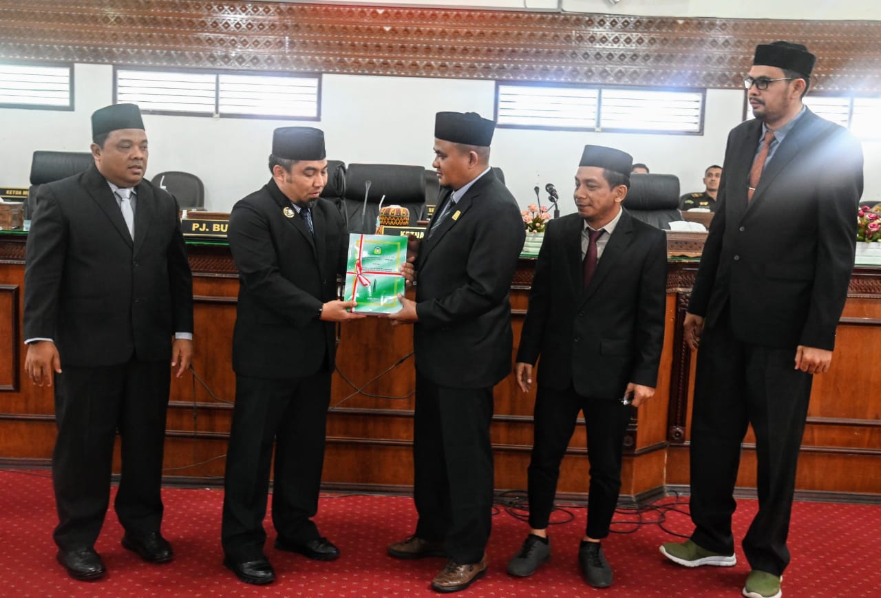 Pj Bupati Aceh Besar Muhammad Iswanto, S.STP MM didampingi Ketua TAPD sekaligus Sekda Aceh Besar Drs Sulaimi, menyerahkan Penyampaian Pengantar Nota Keuangan dan Rancangan Qanun Kabupaten Aceh kepada Wakil Ketua DPRK Zulfikar Azis SE didampingi Wakil Ketua Gunawan SE dan Sekwan Fata Muhammad, di Gedung DPRK Aceh Besar, Kota Jantho, Senin (24/6/2024). FOTO/MC ACEH BESAR