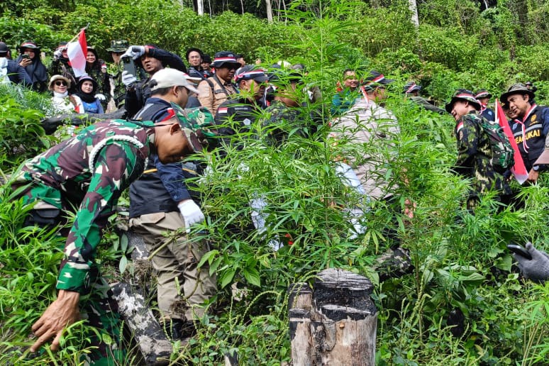Habapublik.com, Aceh Besar: Personel Kodim 0101/Kota Banda Aceh bersama Badan Narkotika Nasional Republik Indonesia (BNN RI) melaksanakan operasi pemusnahan ladang ganja di wilayah Kabupaten Aceh Besar, Provinsi Aceh sebagai bagian dari rangkaian peringatan Hari Ulang Tahun (HUT) ke-79 Republik Indonesia.
