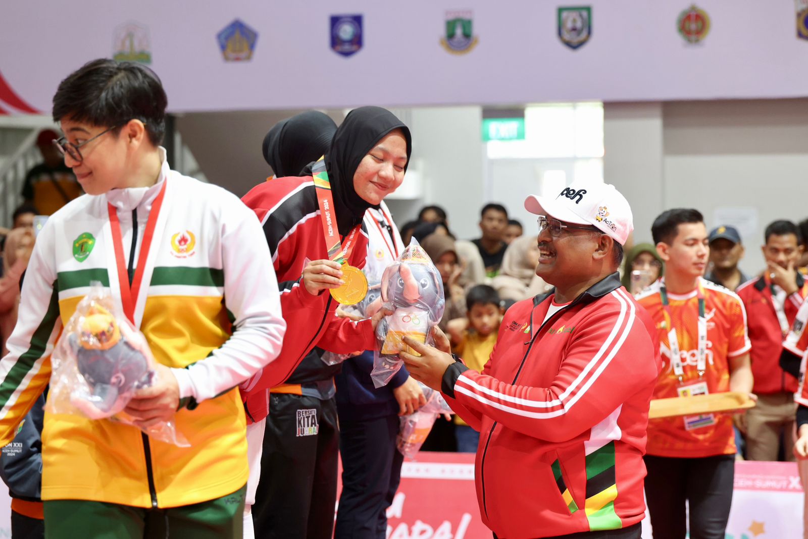 Habapublik.com, Banda Aceh: Cabang olahraga Anggar kembali mempersembahkan medali emas untuk Aceh, melalui nomor Sabel Beregu Putri. Usai pertandingan final, Penjabat Gubernur Aceh Safrizal ZA, yang sejak awal laga menyaksikan aksi tim Aceh, mengalungkan medali kepada para pemenang, Senin (16/9/2024).