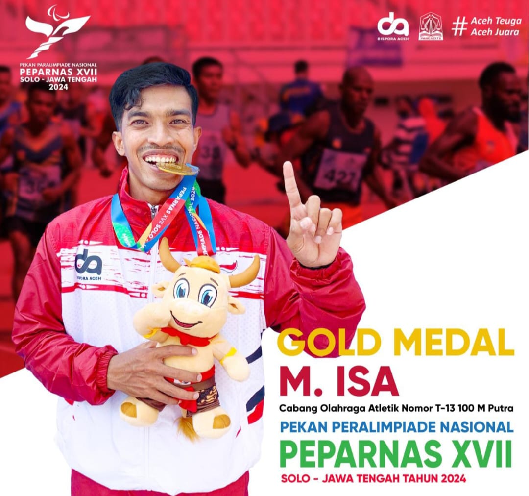 Kepingan dua medali emas yang diraih atlet Serambi Mekkah adalah yang disumbangkan oleh Muhammad Isa dari Cabang Olahraga Para Atletik Putra, nomor Lari 100 M T13 dan emas kedua dipersembahkan juga nomor T-13 untuk nomor 200 meter.
