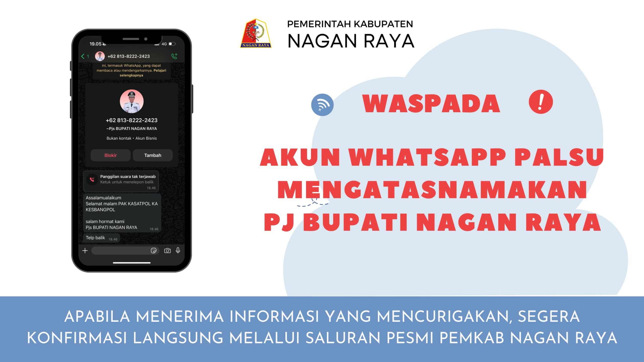 Akun WhatsApp palsu ini dilaporkan telah menghubungi sejumlah pihak, mengatasnamakan Pj. Bupati, dan berpotensi digunakan untuk penipuan atau tindakan-tindakan lain yang merugikan masyarakat.