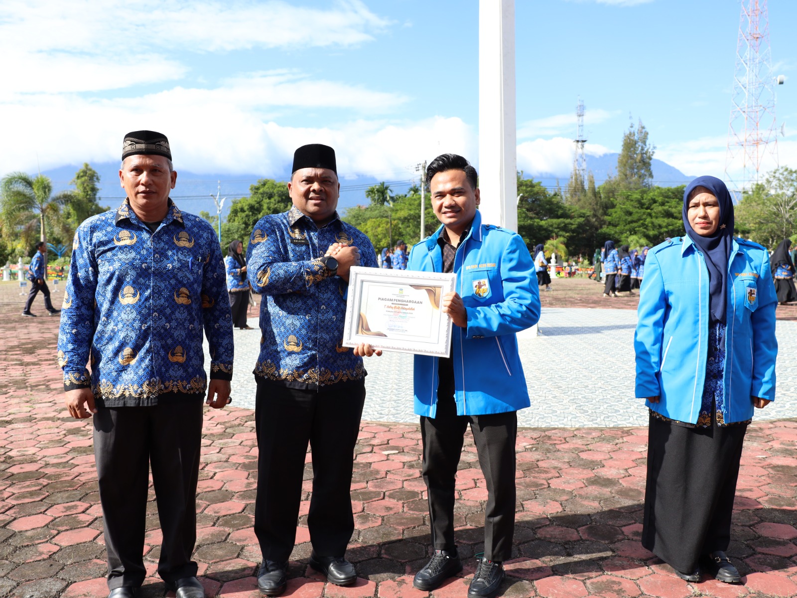 Sekda Aceh Besar Drs Sulaimi MSi, didampingi Kadisparpora Aceh Besar Abdullah SSos, menyerahkan penghargaan kepada pemuda peraih Juara I videografis tingkat Nasional mewakili Aceh di Kalimantan Selatan, usai apel gabungan peringatan Hari Sumpah Pemuda ke-96, di lapangan upacara Kantor Bupati Aceh Besar, di Kota Jantho, Senin (28/10/2024) pagi. FOTO/ MC ACEH BESAR