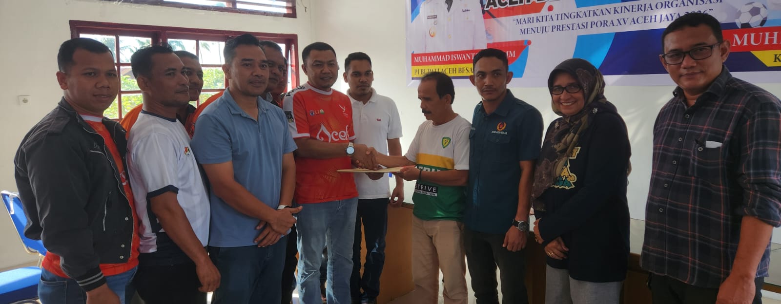 Bakhtiar, ST, M.Si didampingi sejumlah pendukung menyerahkan berkas yang diterima Anggota tim Penjaringan dan Penyaringan Hamdani saat mendaftarkan diri sebagai calon ketua umum Pengurus Komite Olahraga Nasional Indonesia (KONI) Aceh Besar periode 2024-2028 di Sekretariat Panitia Musyawarah Olahraga Kabupaten (Musorkab) KONI Aceh Besar di Kawasan Lambaro, Ingin Jaya, Selasa sore (29/10/2024). Foto/Syahril Ahmad.