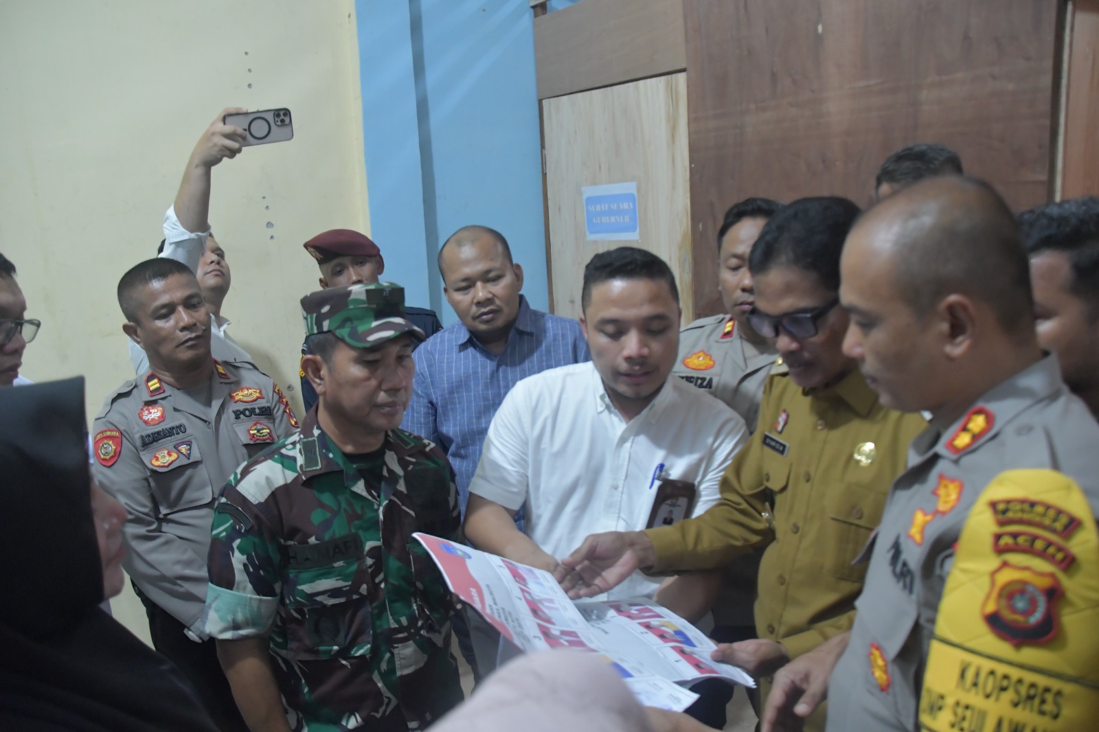 Pj Walikota Langsa Dr Syaridin S.Pd., M.Pd bersama unsur Forkopimda melakukan pengecekan di kantor Komisi Independen Pemilihan (KIP) Kota Langsa. Senin (04/11/2024). Foto/Prokopim Langsa.