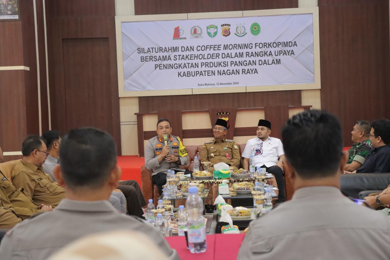 Suka Makmue: Dalam rangka meningkatkan ketahanan pangan dan mendorong produksi pangan lokal, Forkopimda Kabupaten Nagan Raya menggelar acara “Coffee Morning”.Acara ini dilaksanakan pada hari Selasa tanggal 12 November 2024 bertempat di Aula Bhara Daksa Mapolres Nagan Raya.