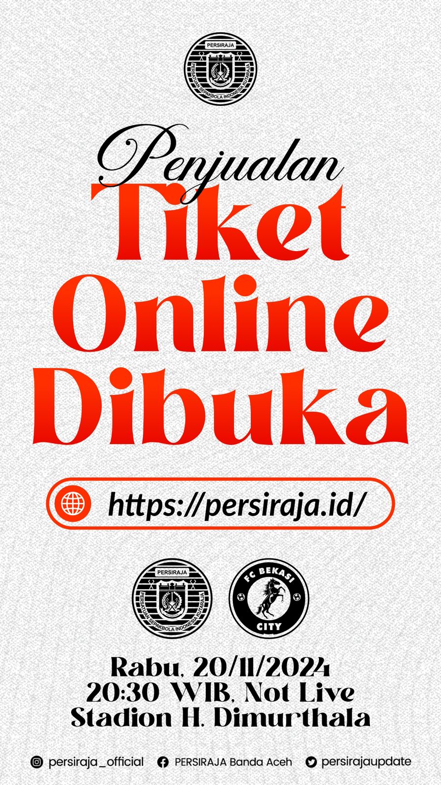 Manager ticketing Persiraja, Rijalul Farisan mengatakan, tiket dijual mulai H-3 untuk mempermudah masyarakat mendapatkan tiket via online. “Tiket kita jual online di website Persiraja.id dan offline di stadion pada hari pertandingan kalau tiketnya belum habis terjual online,” kata Rijalul kepada media, Senin (18/11/2024).