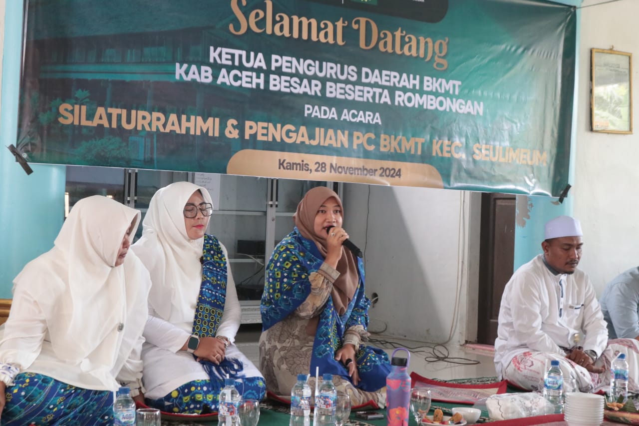 Habapublik.com, Kota Jantho: Ketua pengurus daerah Badan Kontak Majelis Taklim (BKMT) sekaligus Penjabat (Pj) Ketua TP-PKK Kabupaten Aceh Besar Cut Rezky Handayani, SIP MM mengadakan kunjungan silaturahmi dan Pengajian perdana ke Pengurus Cabang BMKT Kecamatan Seulimeum, bertempat di Meunasah Gampong (desa-red) Keunaloi, Aceh Besar, Kamis (28/11/2024).