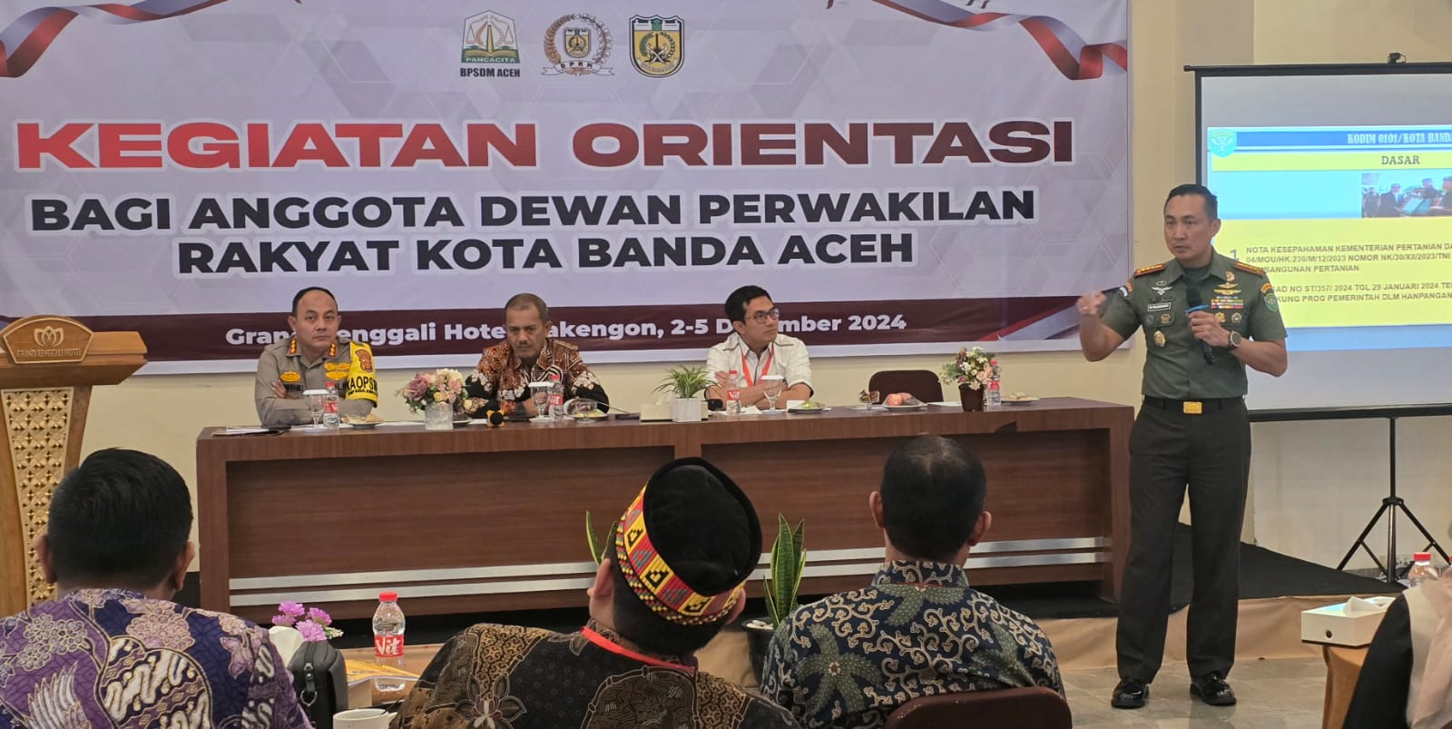 Habapublik.com, Takengon: Dalam rangka mendukung program ketahanan pangan nasional, Dandim 0101/Kota Banda Aceh, Kolonel Czi Widya Wijanarko, S.Sos., M.Tr (Han), menjadi narasumber pada acara Orientasi Anggota DPRK Banda Aceh Masa Jabatan 2024-2029.
