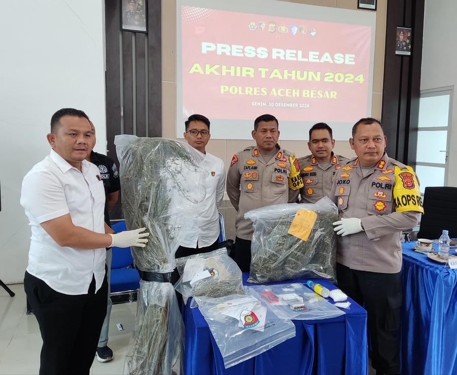 Hal itu dikatakan Kapolres Aceh Besar AKBP Sujoko S.I.K.,M.H., didampingi Kasat Narkoba, Kasar Reskrim, Kabag Ops dan Kasat Lantas saat menggelar Press Release jelang akhir tahun bersama wartawan, bertempat di Aula Satya Haprabu Mapolres Aceh Besar, Senin (30/12/2024).