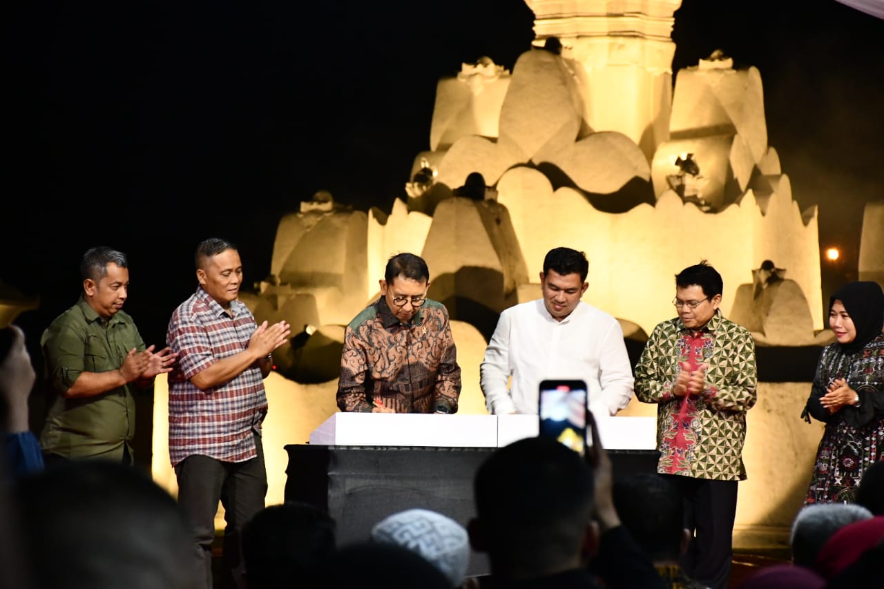 Menteri Kebudayaan (Menbud) RI, Fadli Zon dan Penjabat (Pj) Wali Kota Banda Aceh Banda Aceh, Almuniza Kamal menandatangani berita acara saat meresmikan revitalisasi objek wisata Gunongan, Minggu, 12 Januari 2025 malam. Foto/Prokopim Pemko Banda Aceh.