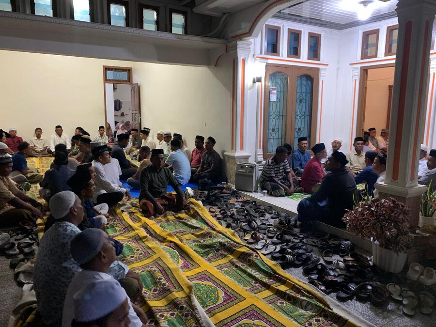 Pj Bupati Aceh Besar Muhammad Iswanto SSTP MM bersama warga Kota Jantho melaksanakan takziah atas meninggalnya alm. Tarmizi, yang merupakan suami dari Kepala Bappeda Aceh Besar, Rahmawati S.Pd MSi di Kota Jantho, Rabu (15/01/2025) malam. FOTO/MC ACEH BESAR