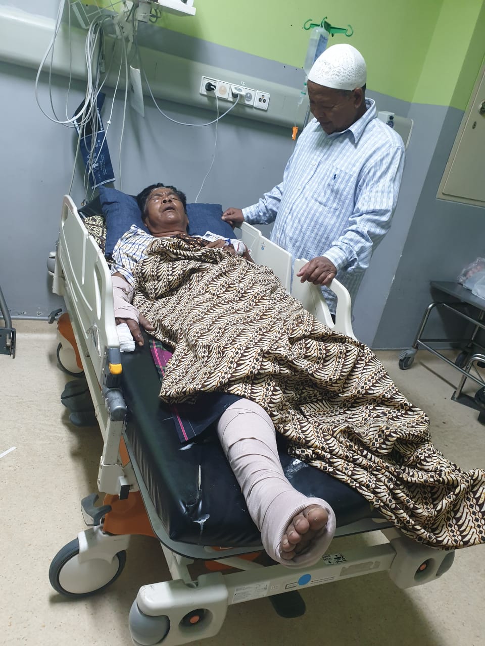 Kondisi korban patah tulang betis kanan, lengan kanan, jari, wajah dipelipis mata kanan membiru, berdarah, tulang pelipis patah.