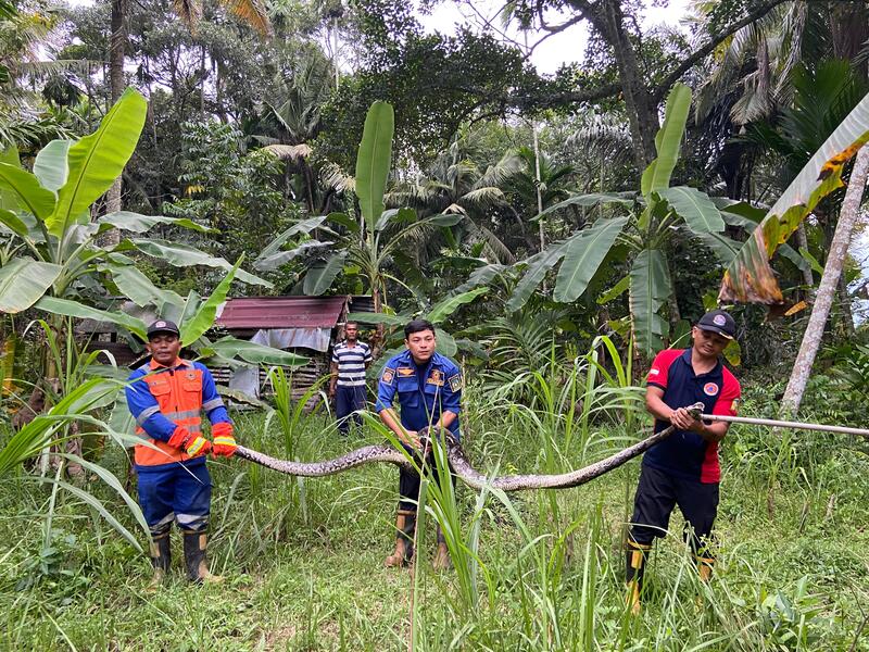 Habapublik.com, Kota Jantho: Damkar BPBD Aceh Besar berhasil mengevakuasi ular piton sepanjang 3,5 meter dari sebuah kebun di Gampong Lambarih Jurong Raya Kecamatan Suka Makmur Kabupaten Aceh Besar, Sabtu (1/2/2025).