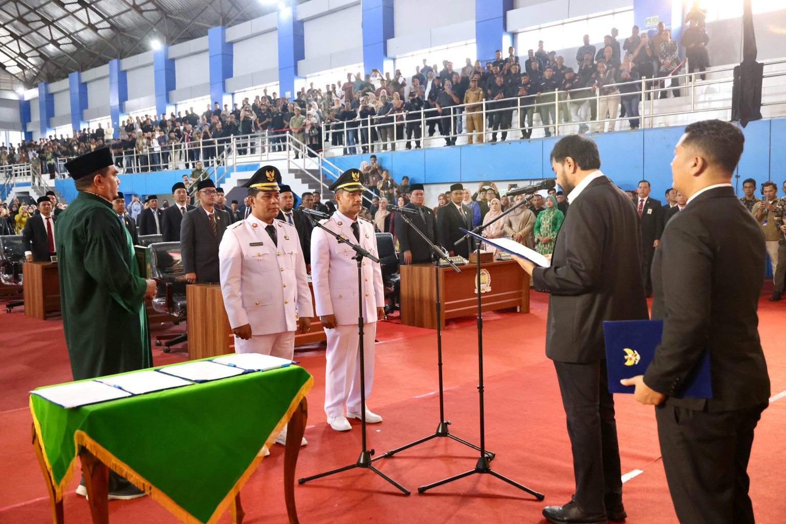 Gubernur Aceh Muzakir Manaf, mengambil sumpah dan melantik Muharram Idris sebagai Bupati Aceh Besar, dan Syukri A Jalil sebagai Wakil Bupati Aceh Besar, pada Rapat Paripurna DPRK Aceh Besar, di Jantho Sport Center, Kamis (13/2/2025). Foto/Biro Adpim Setda Aceh.