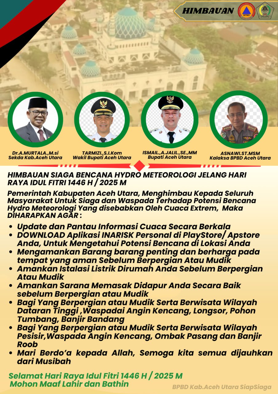 Dalam seruan dikeluarkan Pemerintah Aceh Utara jelang Lebaran idul Fitri 1446 H, masyarakat diminta untuk memantau cuaca secara berkala, melalui Aplikasi Narisk, agar dapat mengetahui bencana di sekitar lokasi berasa.