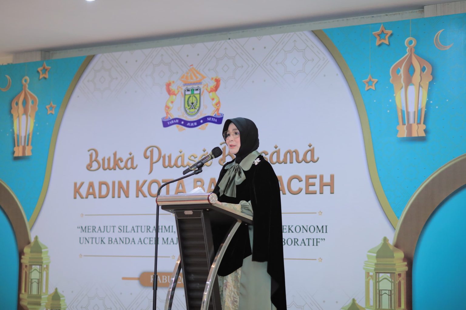 Wali Kota Banda Aceh Illiza Sa’aduddin Djamal menyampaikan sambutan saat menghadiri undangan buka puasa bersama pengurus Kadin Banda Aceh di Hotel Al Hanifi, Lampriet, Rabu, (26/3/2025). Foto/Prokopim Setdako Banda Aceh