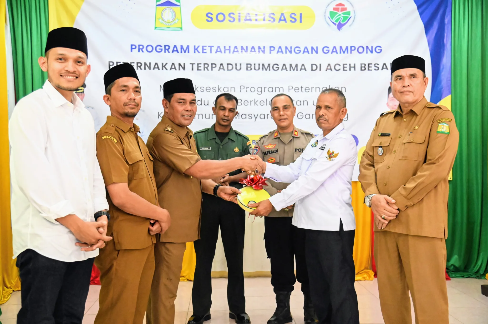 Habapublik.com, Kota Jantho: Bupati Aceh Besar H. Syech Muharram Idris membuka sosialisasi program ketahanan pangan melalui Peternakan Terpadu Badan Usaha Milik Gampong Bersama (BUMGAMA) di Aula UDKP Sukamakamur, Aceh Besar, Selasa (8/4/2025).