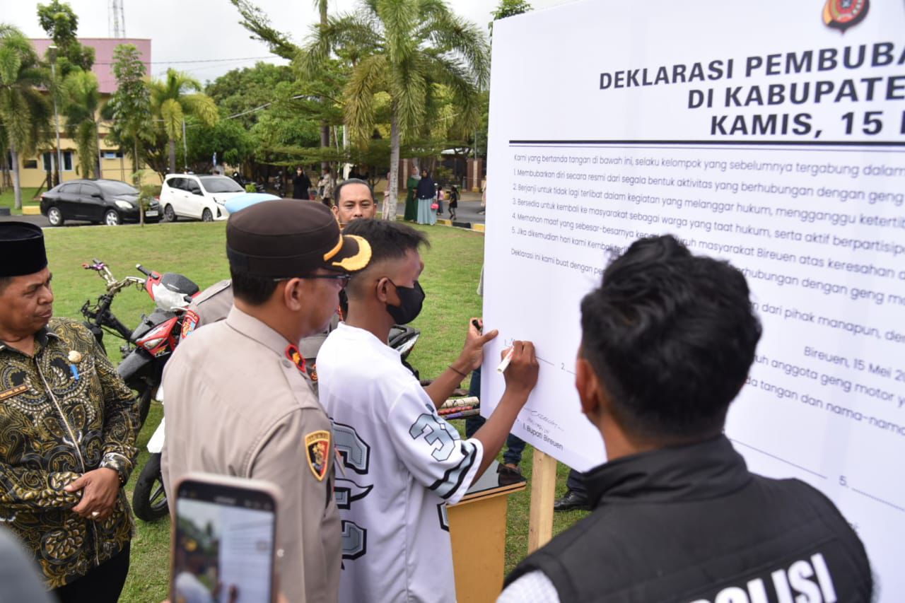Deklarasi tersebut dipimpin Kapolres Bireuen AKBP Tuschad Cipta Herdani, diwakili Wakapolres Bireuen Kompol Fauzi. Deklarasi ini juga turut dihadiri oleh Asisten I Setdakab Bireuen Mulyadi, serta pejabat dari Dinas Pendidikan, Kacabdin, kepala sekolah, dan para orang tua anggota geng motor.