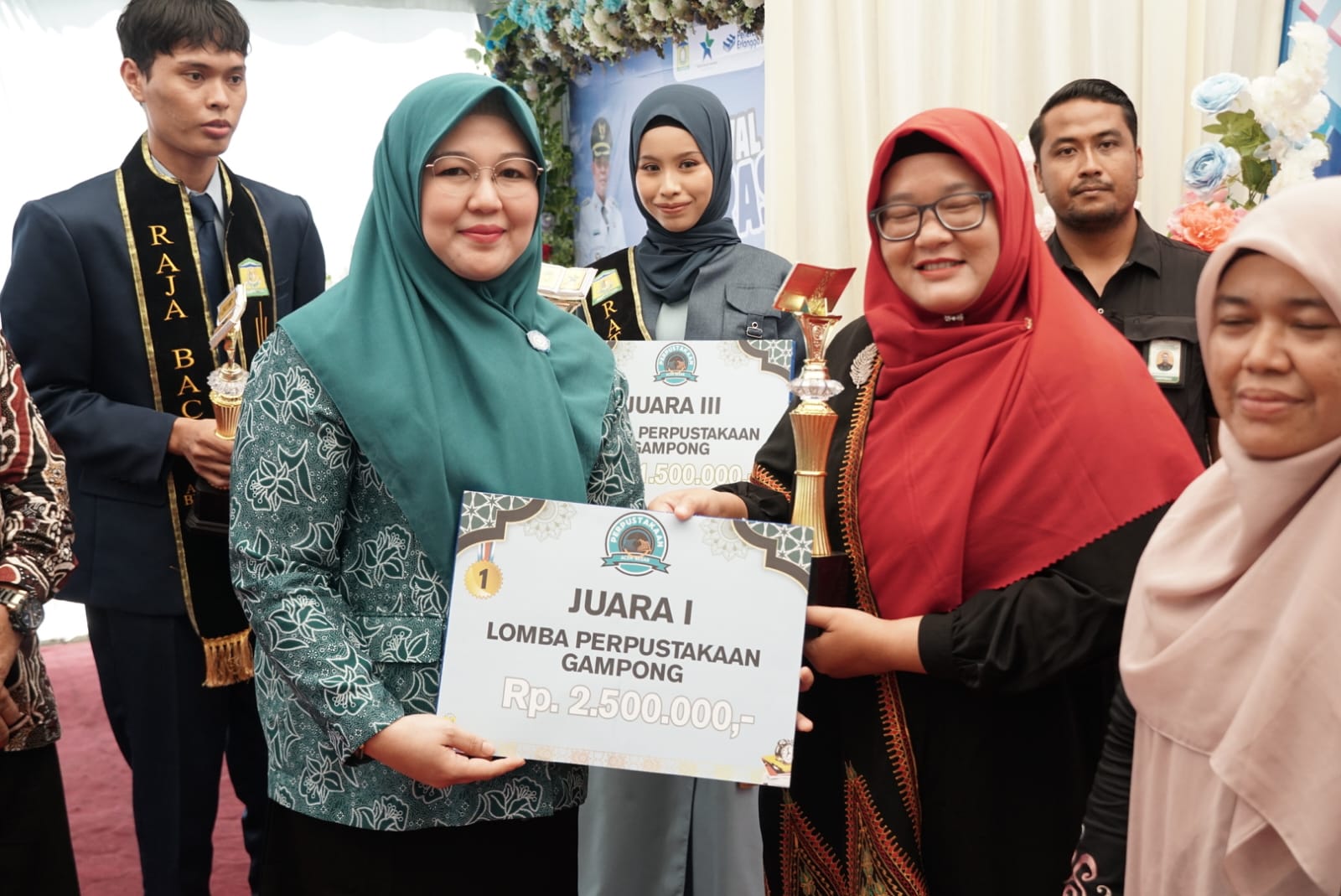 Bunda Literasi Aceh Besar Rita Mayasari, menyerahkan hadiah juara lomba Perpustakaan terbaik pada saat menutup Festival Literasi di halaman Dinas Perpustakaan dan Kearsipan, Kota Jantho, Kamis (22/05/2025). FOTO/MC ACEH BESAR