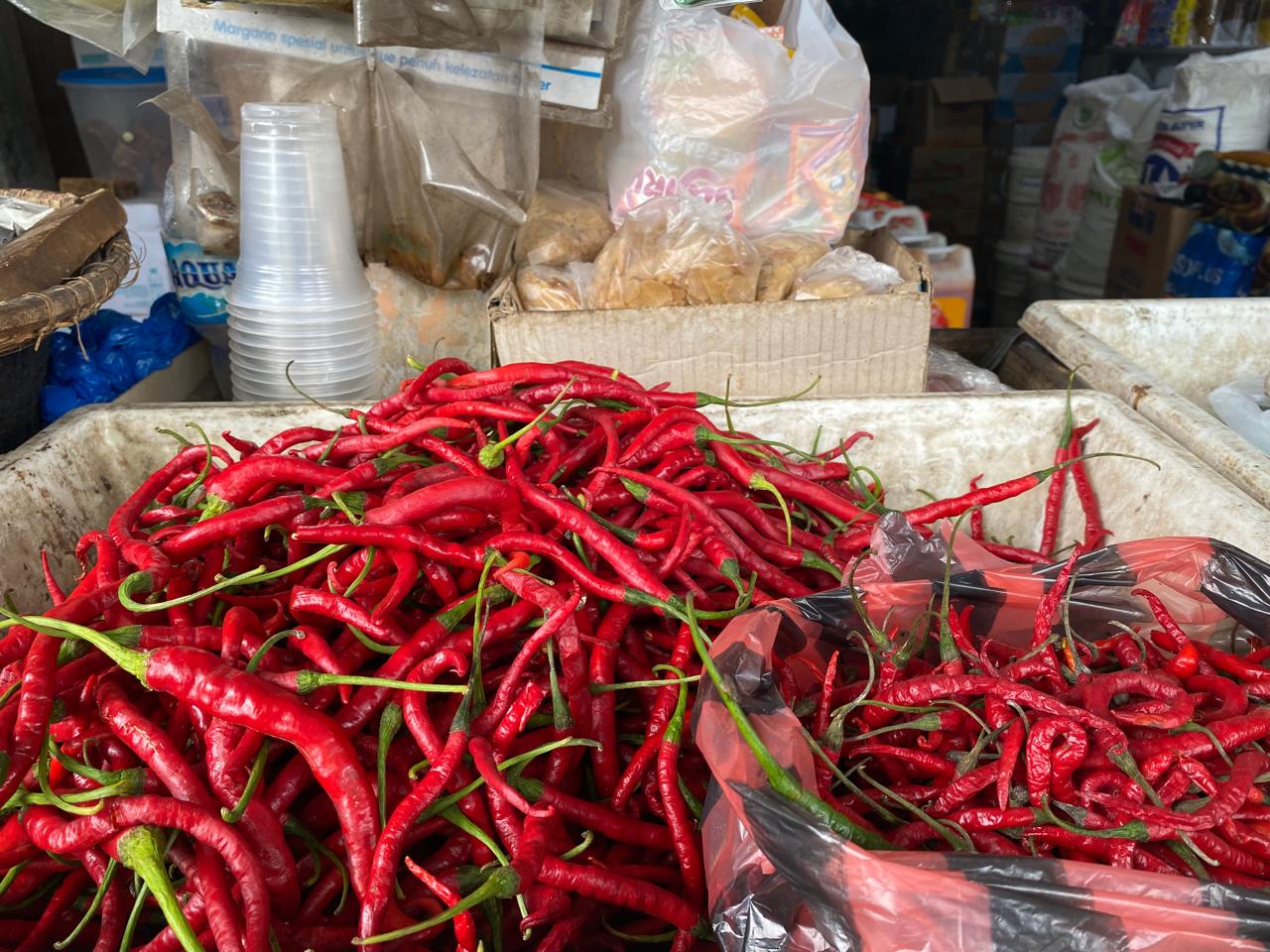 Cabai merah keriting dan rawit, baik merah maupun hijau, seluruhnya dijual seharga Rp30.000 per kilogram, cabai merah besar Rp28.000 per kilogram. Bawang merah masih di angka Rp38.000 per kilogram, sedangkan bawang putih berada di harga Rp40.000.