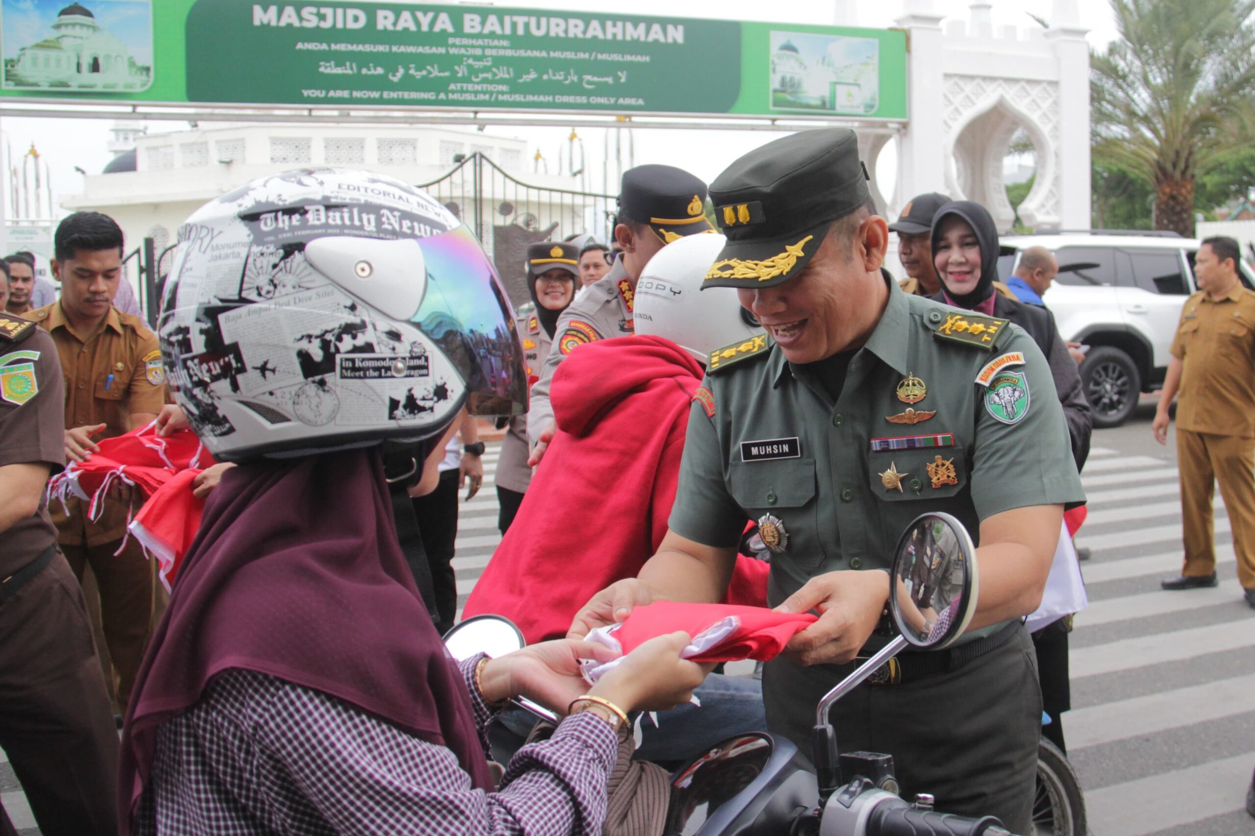 Habapublik.com, Banda Aceh: Menyambut Hari Ulang Tahun (HUT) ke-80 Kemerdekaan Republik Indonesia, Kasdim 0101/Kota Banda Aceh, Letkol Inf Muhsin, S.Ag., M.A.P., bersama Forkopimda Kota Banda Aceh melaksanakan pembagian Bendera Merah Putih di depan Masjid Raya Baiturrahman, Banda Aceh, Senin (11/08/2025).