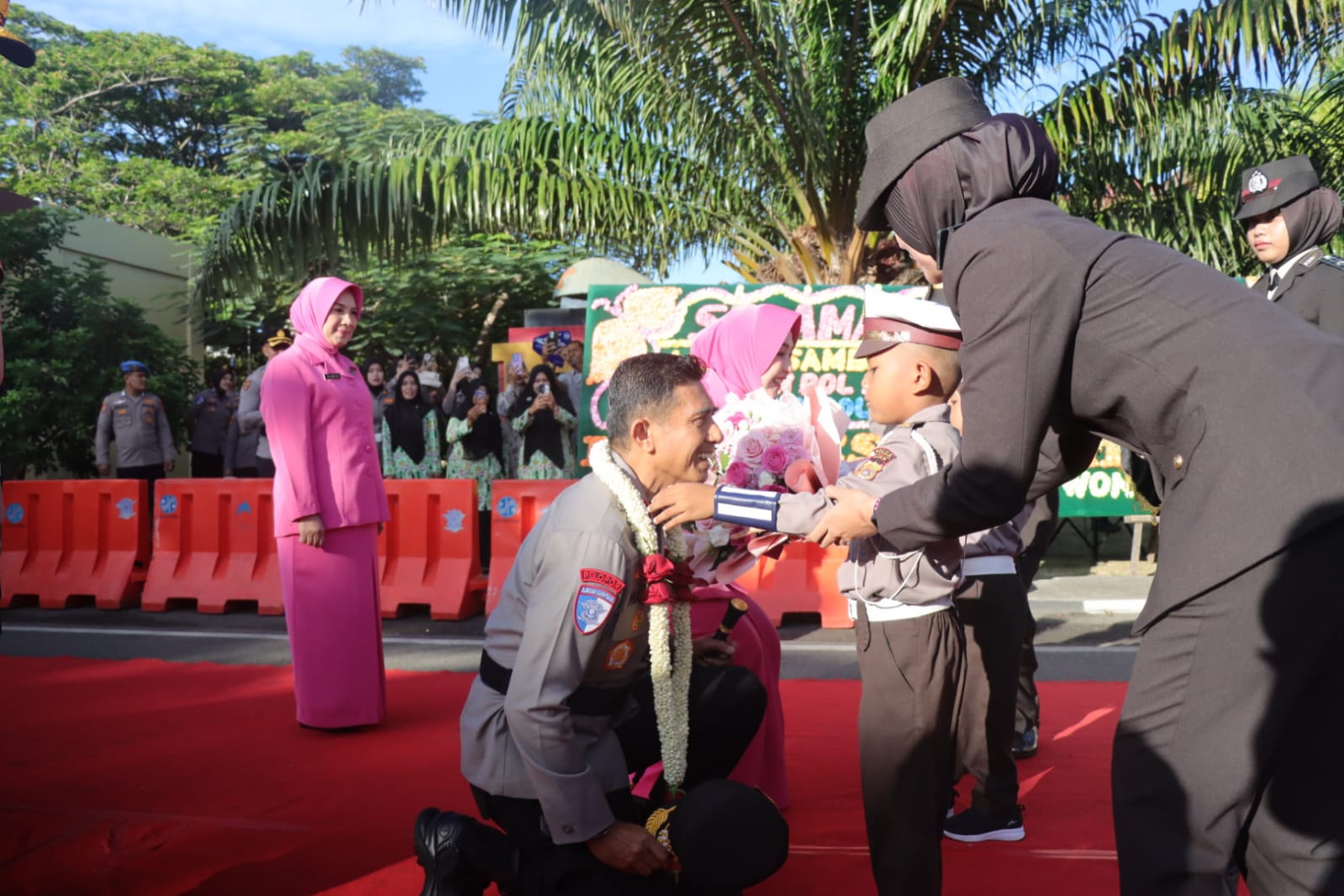 Sebagai bentuk penghormatan, Kapolda Aceh yang baru juga dikalungi bunga oleh polisi cilik. Tak hanya itu, Ny. Irawati Marzuki juga menerima buket bunga dari polisi cilik sebagai simbol penghormatan dan doa selamat datang.