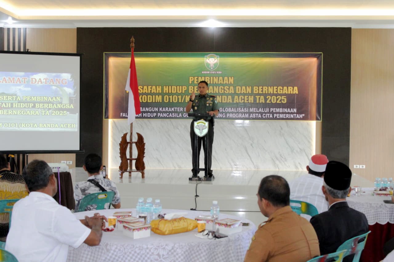 Banda Aceh: Suasana penuh makna dan kebersamaan terlihat jelas di Aula Lantai II Makodim 0101/Kota Banda Aceh, Jalan S.T.A Mahmudsyah Nomor 32, Gampong Baro, Kecamatan Baiturrahman, saat Kodim 0101/KBA menggelar kegiatan Pembinaan Falsafah Hidup Berbangsa dan Bernegara, Selasa (26/8/2025).