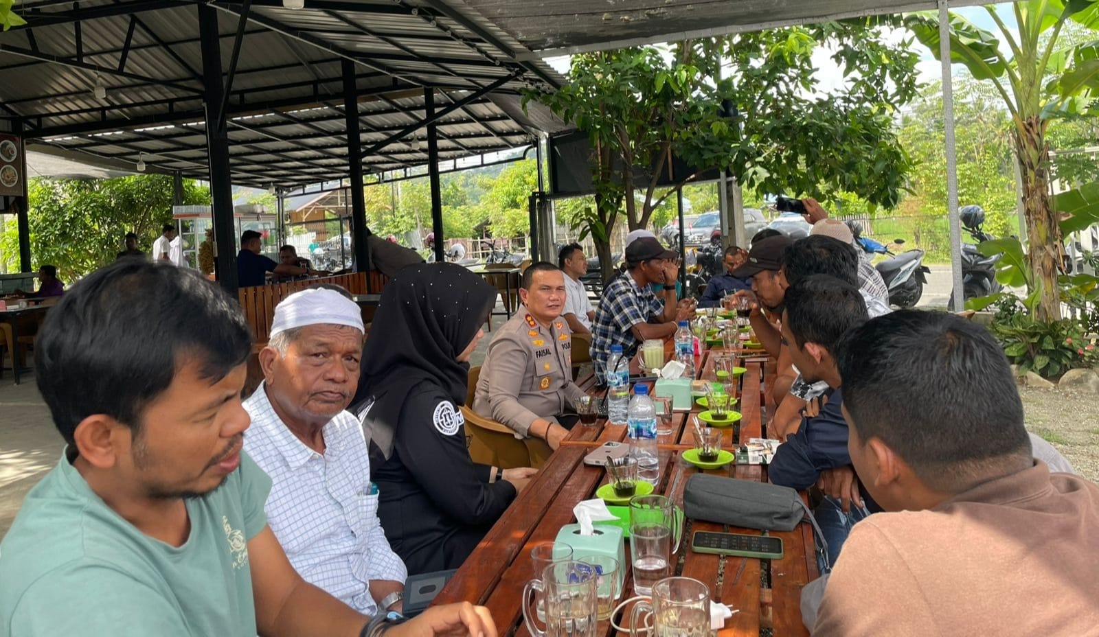 Ngopi santai Kapolres Pidie Jaya, Ahmad Faisal Pasaribu bersama sejumlah awak media (insan pers). Foto/Hermansyah