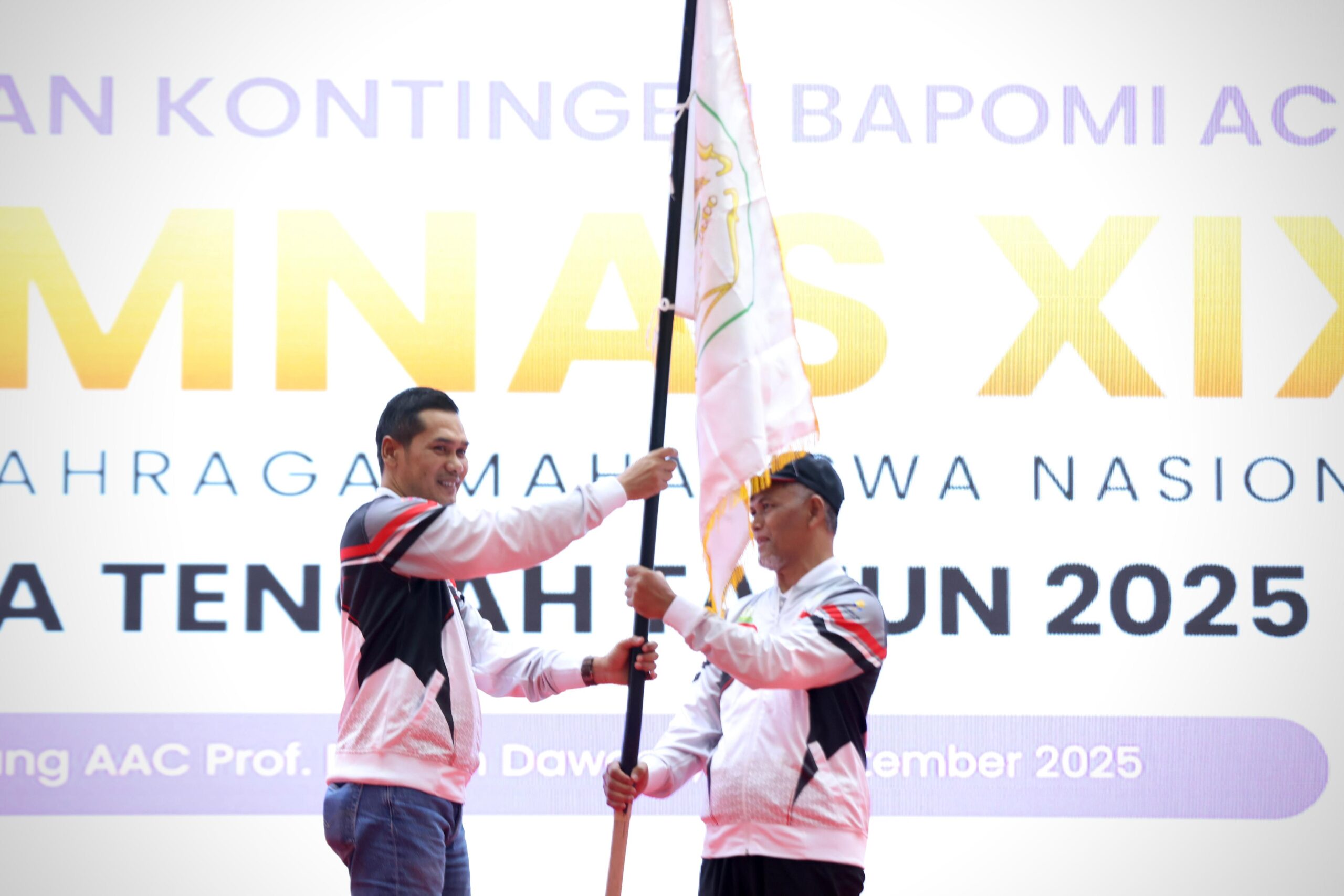 Habapublik.com, Banda Aceh: Sekretaris Daerah (Sekda) Aceh, M. Nasir, melepas kontingen Badan Pembina Olahraga Mahasiswa Indonesia (BAPOMI) Aceh yang akan berlaga pada Pekan Olahraga Mahasiswa Nasional (Pomnas) XIX di Jawa Tengah, 19–28 September 2025. Prosesi pelepasan berlangsung di Gedung AAC Dayan Dawood, Kampus Universitas Syiah Kuala (USK), Selasa (16/9/2025).
