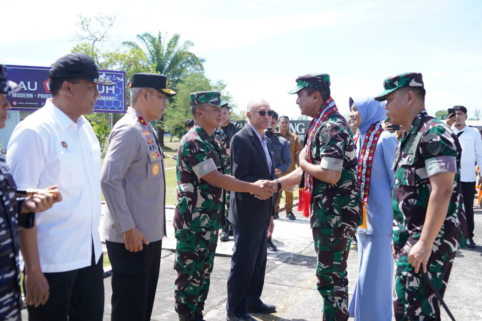 Habapublik.com, Aceh Besar: Panglima Komando Daerah Militer Iskandar Muda (Pangdam IM) Mayor Jenderal TNI Joko Hadi Susilo, S.I.P., menyambut secara langsung kedatangan Kepala Staf Angkatan Udara (Kasau) Marsekal TNI Mohamad Tonny Harjono, S.E., M.M., beserta Ketua Umum PIA Ardhya Garini, dan rombongan di Pangkalan Udara Sultan Iskandar Muda (Lanud SIM), Aceh Besar, Senin (22/9/2025) pagi.