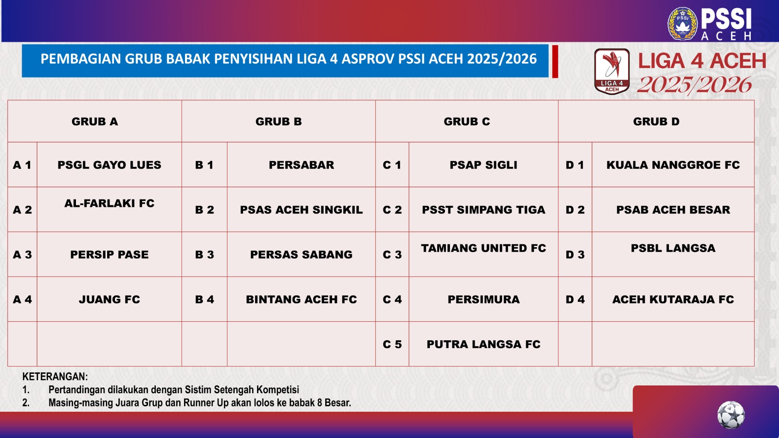 Sekretaris Umum Asprov PSSI Aceh, Nazaruddin menjelaskan, 17 tim tersebut dibagi dalam empat grup yang bertanding dengan sistim setengah kompetisi.