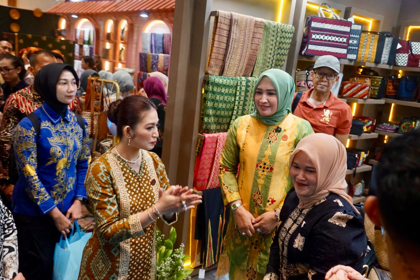 Ny. Selvi tampak antusias melihat satu per satu produk yang dipamerkan, sekaligus berbincang hangat dengan Ny. Marlina Muzakir dan Ny. Mukarramah Fadhlullah mengenai kreativitas pengrajin Aceh serta potensi pengembangannya.