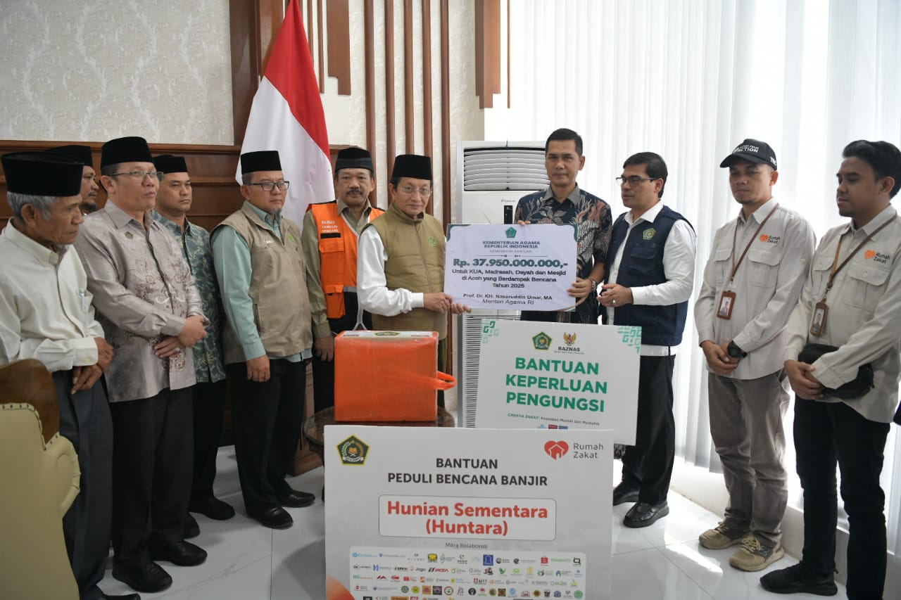 ‎Berdasarkan data yang tercantum dalam dokumen bantuan, Kementerian Agama RI menyalurkan bantuan dengan total nilai sebesar Rp37.950.000.000. Bantuan tersebut diperuntukkan bagi pemulihan dan dukungan terhadap Kantor Urusan Agama (KUA), madrasah, dayah/pesantren, serta masjid dan meunasah di Aceh yang terdampak bencana. Bantuan ini merupakan bagian dari upaya pemerintah pusat dalam mempercepat pemulihan fasilitas keagamaan dan pendidikan yang terdampak bencana hidrometeorologi.