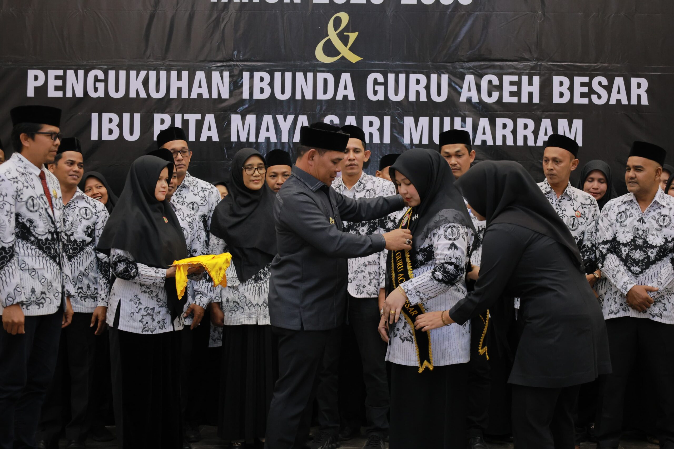 Hj Rita Mayasari kemudian dipakaikan selempang oleh Bupati Aceh Besar H. Muharram Idris (Syech Muharram), disaksikan Wakil Bupati Drs. H. Syukri A. Jalil, Wakil Wali Kota Banda Aceh Afdhal Khalilullah, Sekda Aceh Besar Bahrul Jamil SSos MSi, unsur Forkopimda, Ketua MPD Prof. Mustanir Yahya MSc, serta ratusan guru yang hadir.