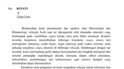 Habapublik.com, Blangkejeren – Badan Meteorologi, Klimatologi, dan Geofisika (BMKG) mengeluarkan peringatan dini terkait potensi cuaca…