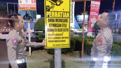 Habapublik.com, Banda Aceh : Personel Ditlantas Polda Aceh memasang papan rambu peringatan electronic traffic law…